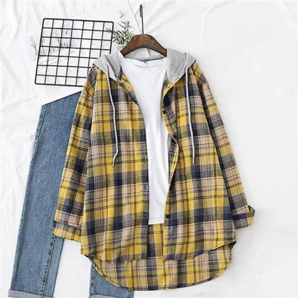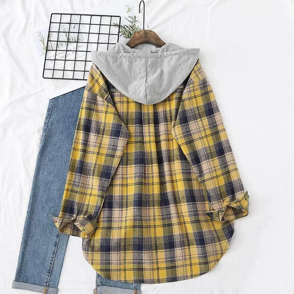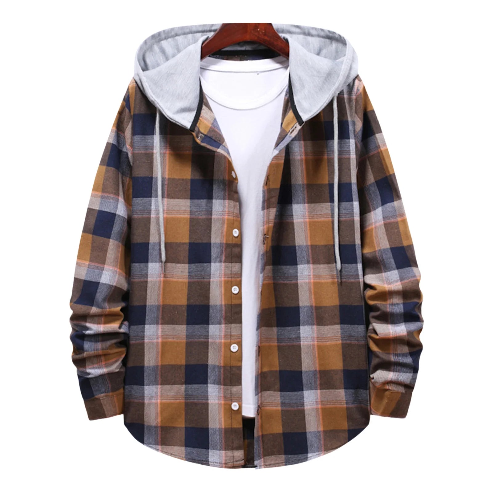 Men Casual Plaid Shirt Hooded Shirts Oversized Casual Shirt Men's Clothes European American Style Handsome Holiday Checked Shirt