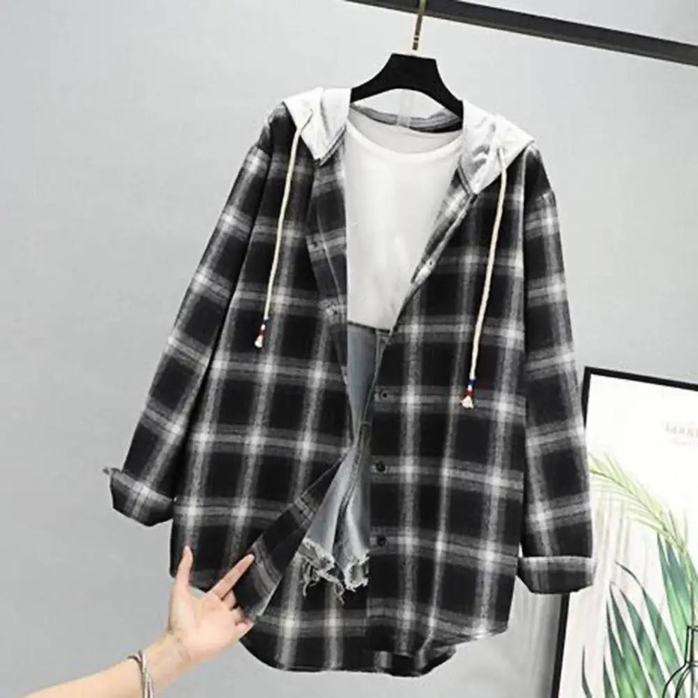 Men Casual Plaid Print Shirt Hooded Oversized Casual Shirt Men's Clothes European American Style Handsome Men Holiday