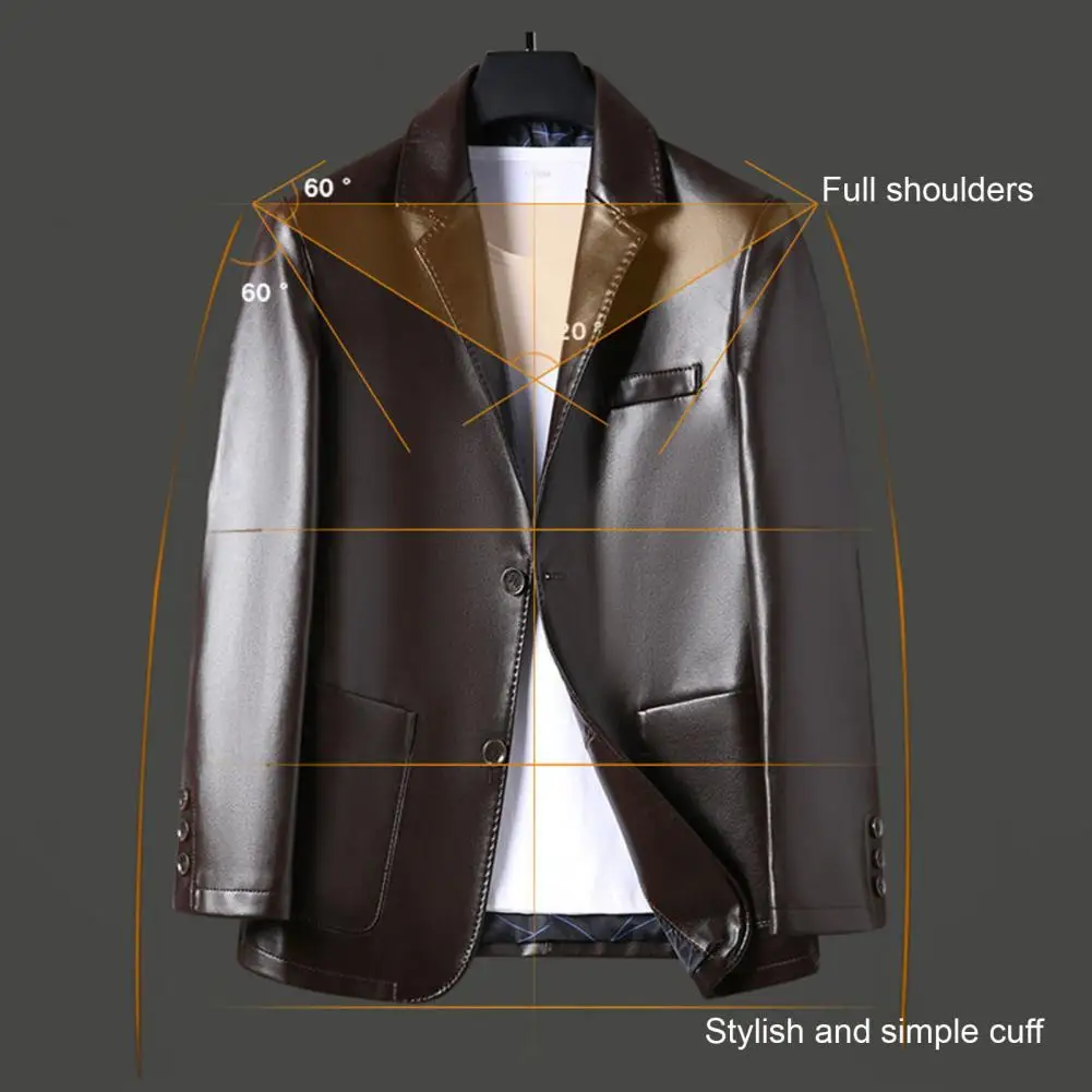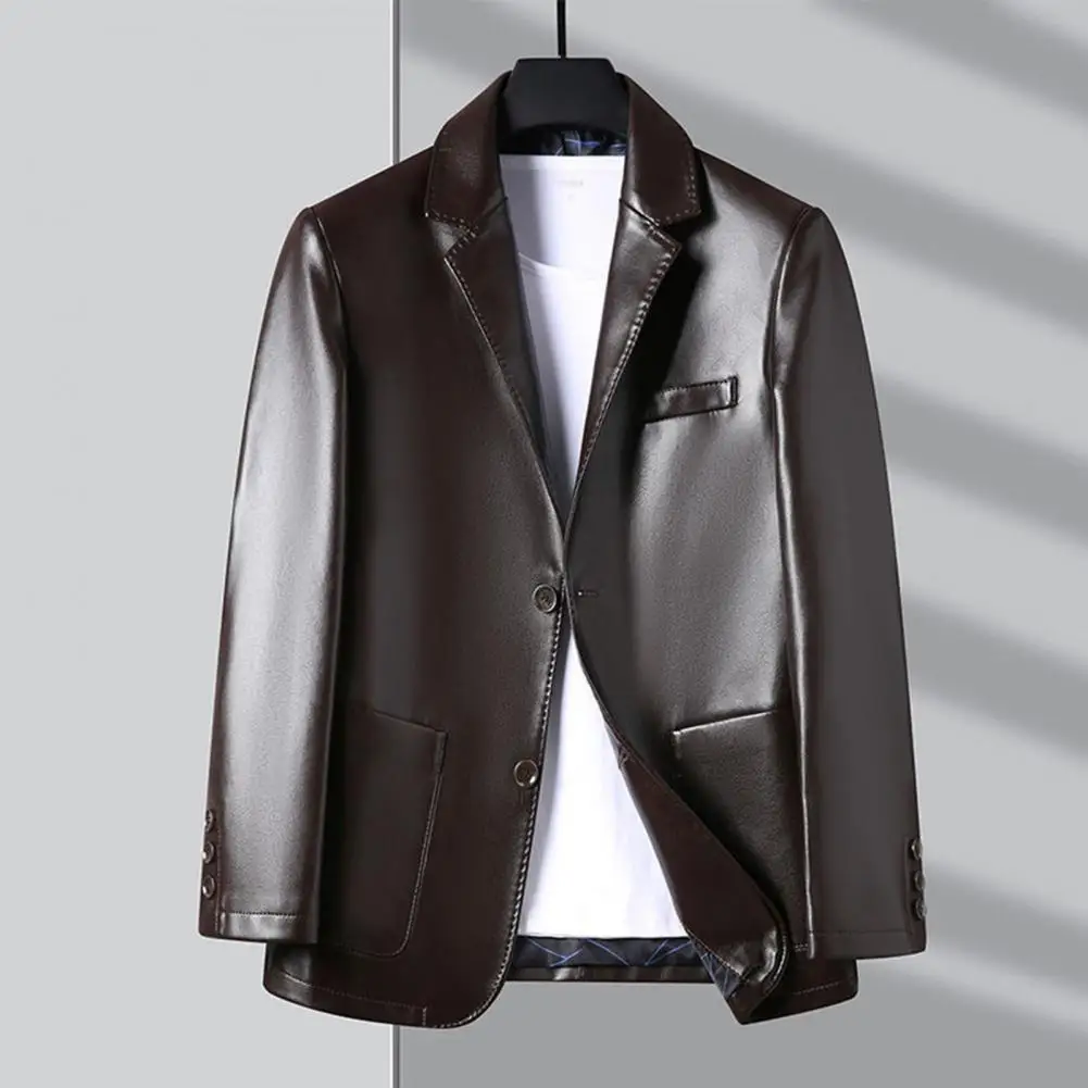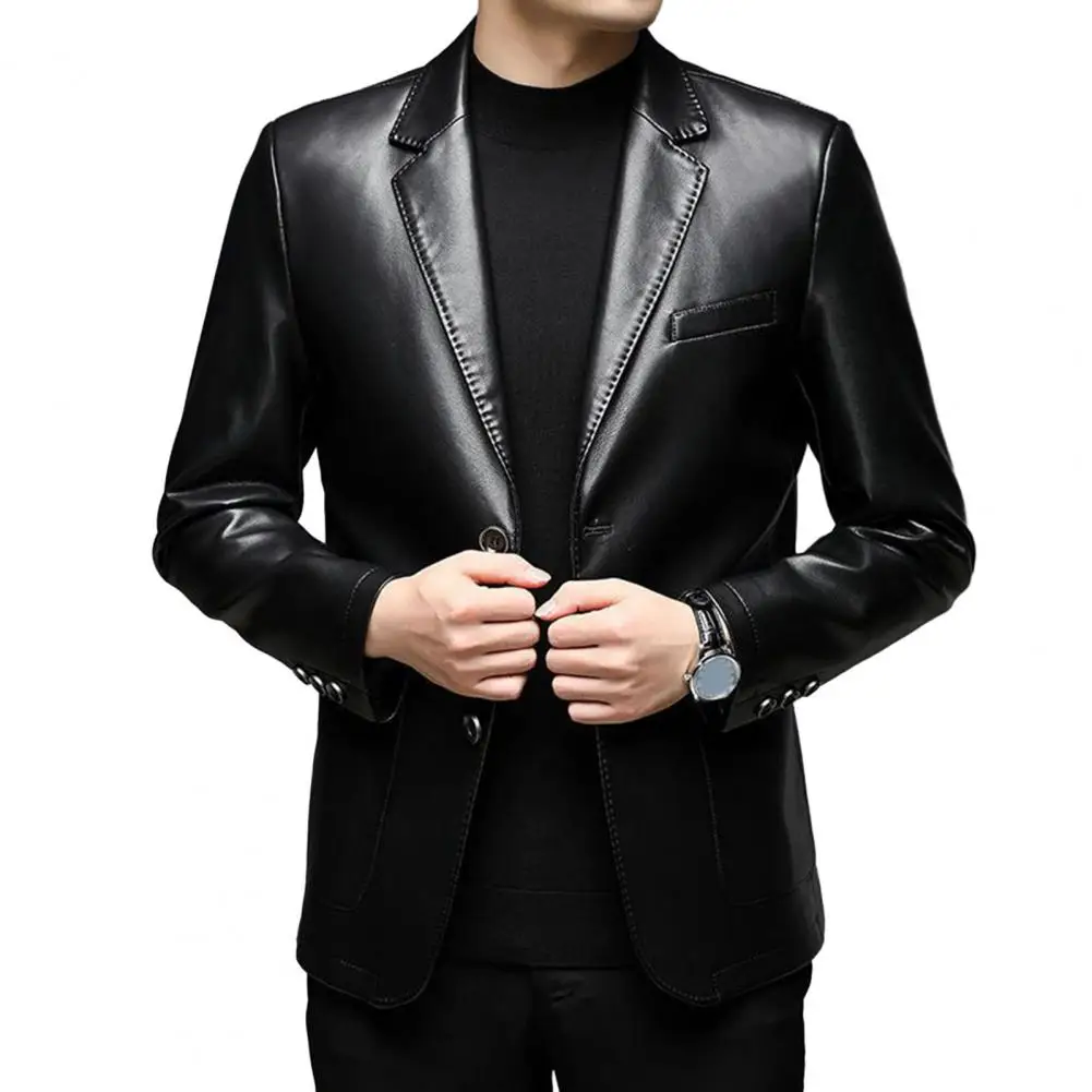 Men Jacket with Pocket Stylish Button Cuffs Lapel Collar Spring Autumn Fake Leather Men Coat for Outdoor Business