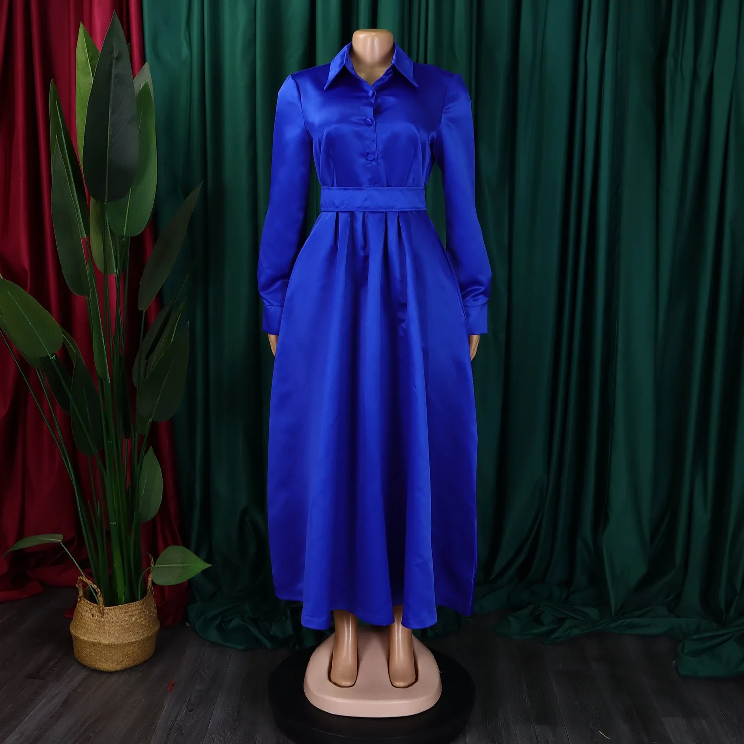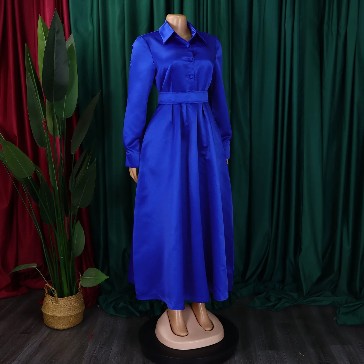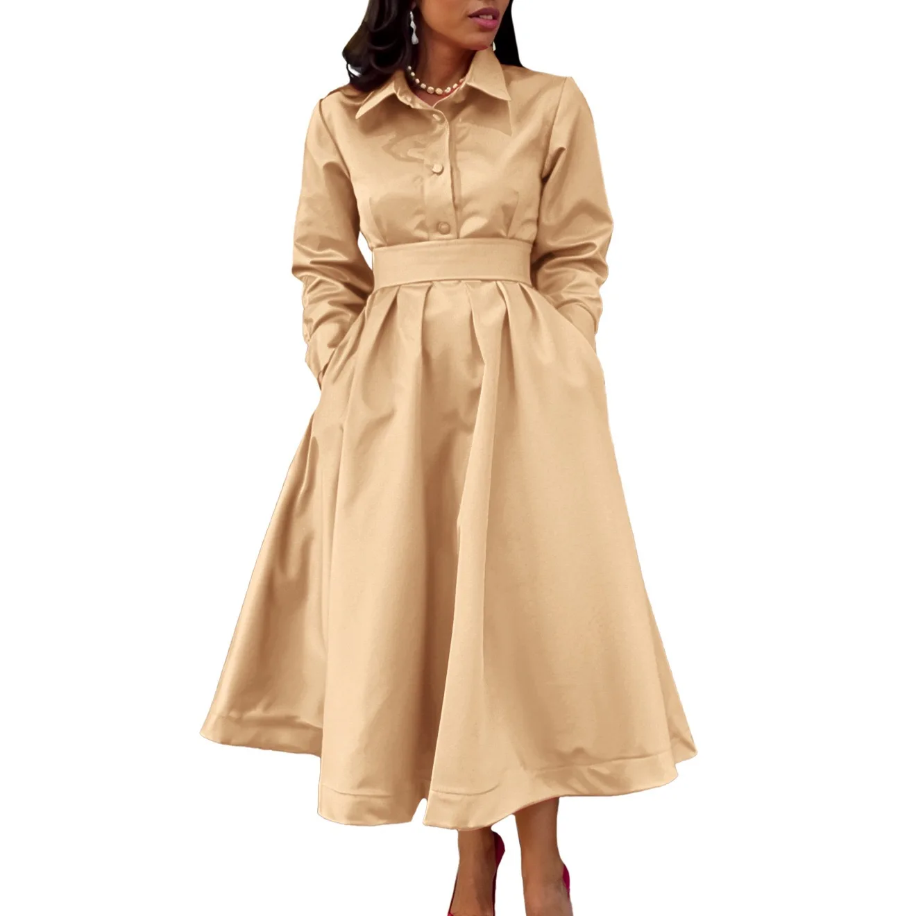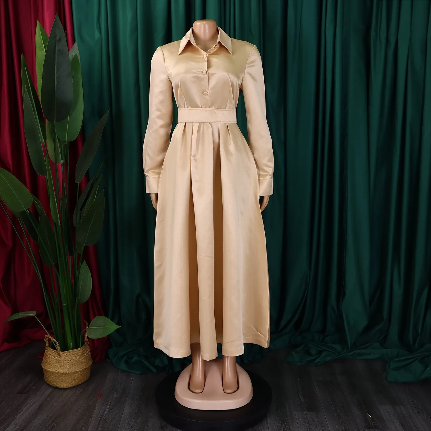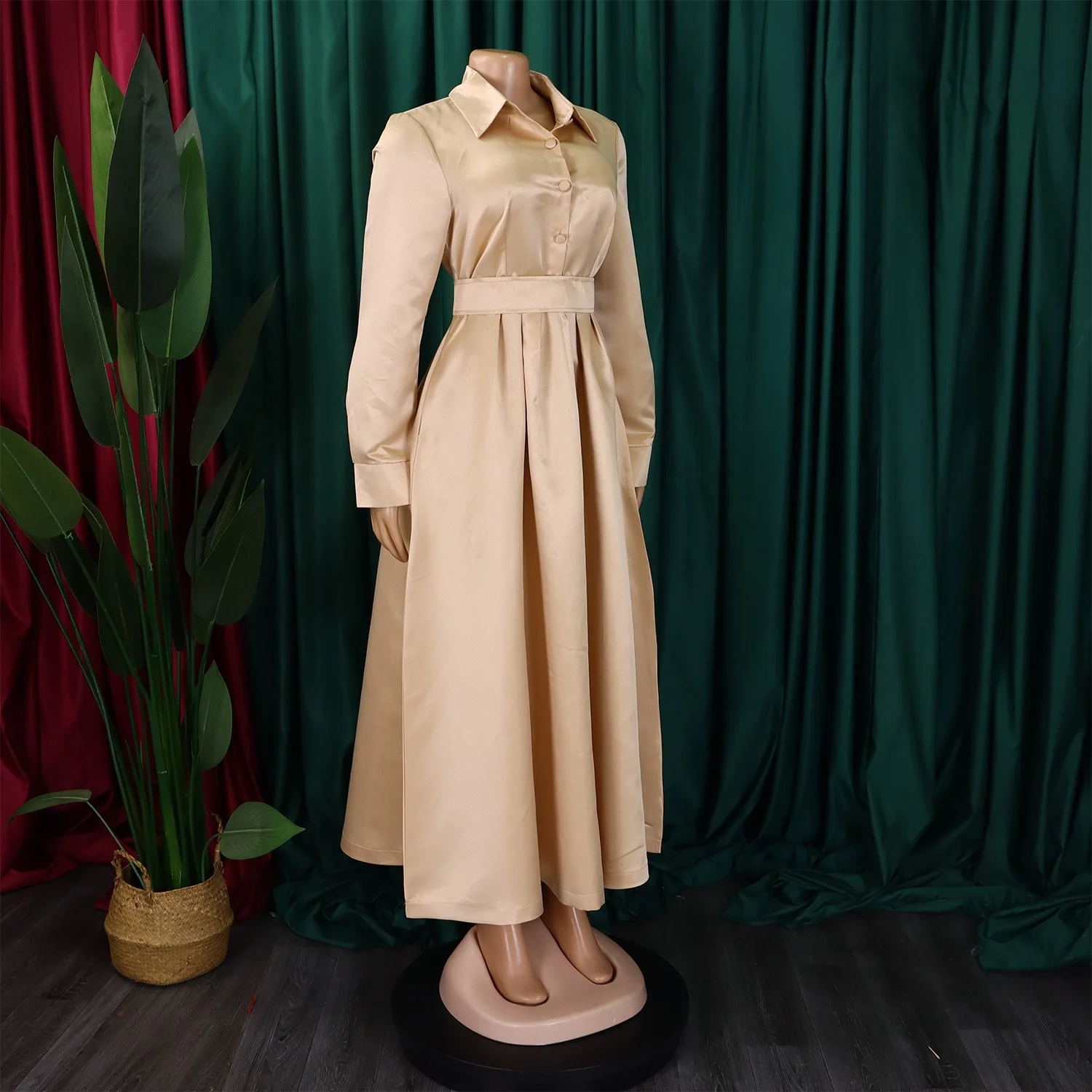 Elegant Party Dresses for Woman Turn Down Collar Single Breasted High Waisted Pleated Mid Calf Luxury Dinner Night Dress Gowns