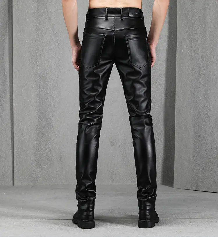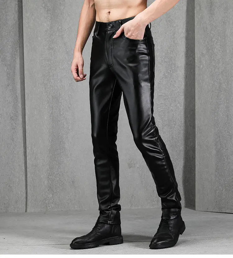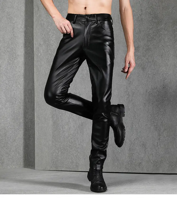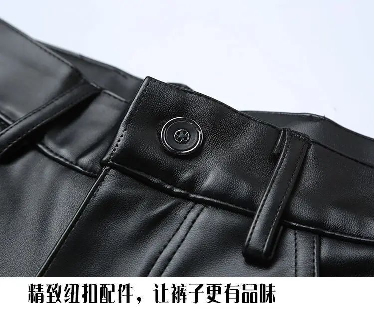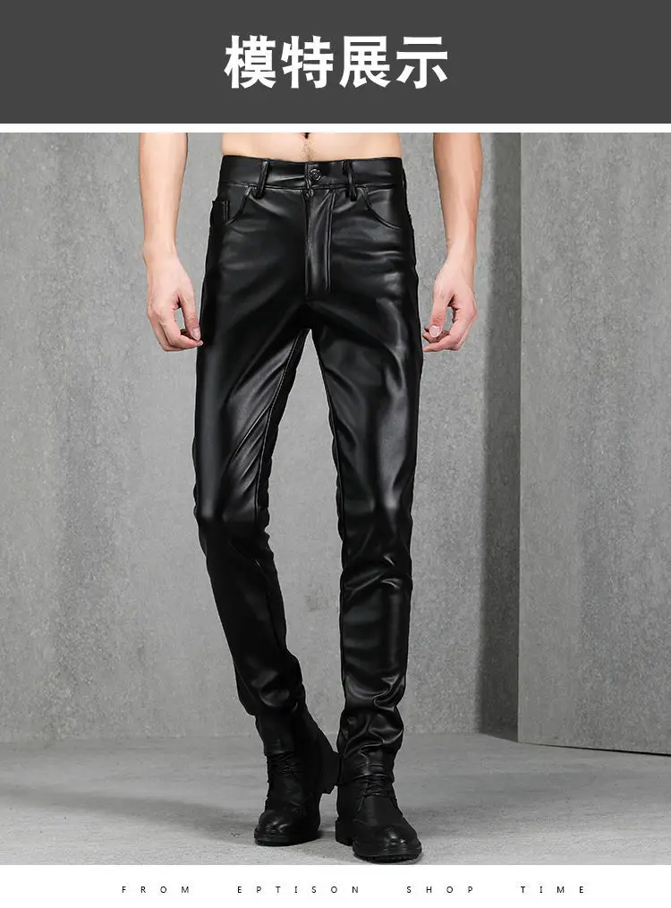 Men's Leather Pants Slim Fit PU Leather Pants Elastic Single Layer Motorcycle Leather Pants Man Waterproof Oil-Proof Young