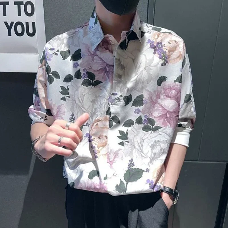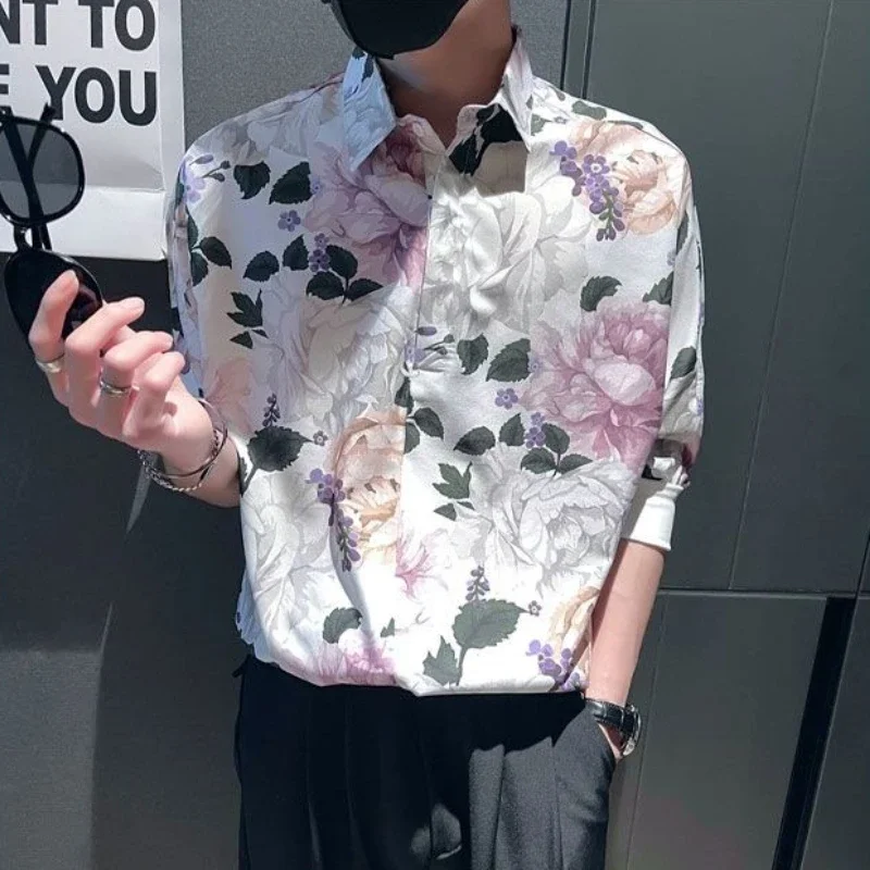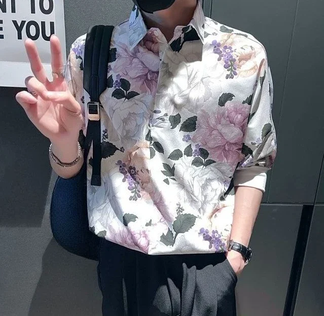 Men's Shirt Half Sleeve White Floral Print Button Up Cotton Sale Fashion 2025 Designer with Sleeves Man Normal Silk Male Shirts