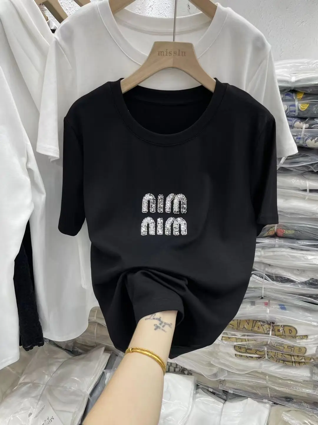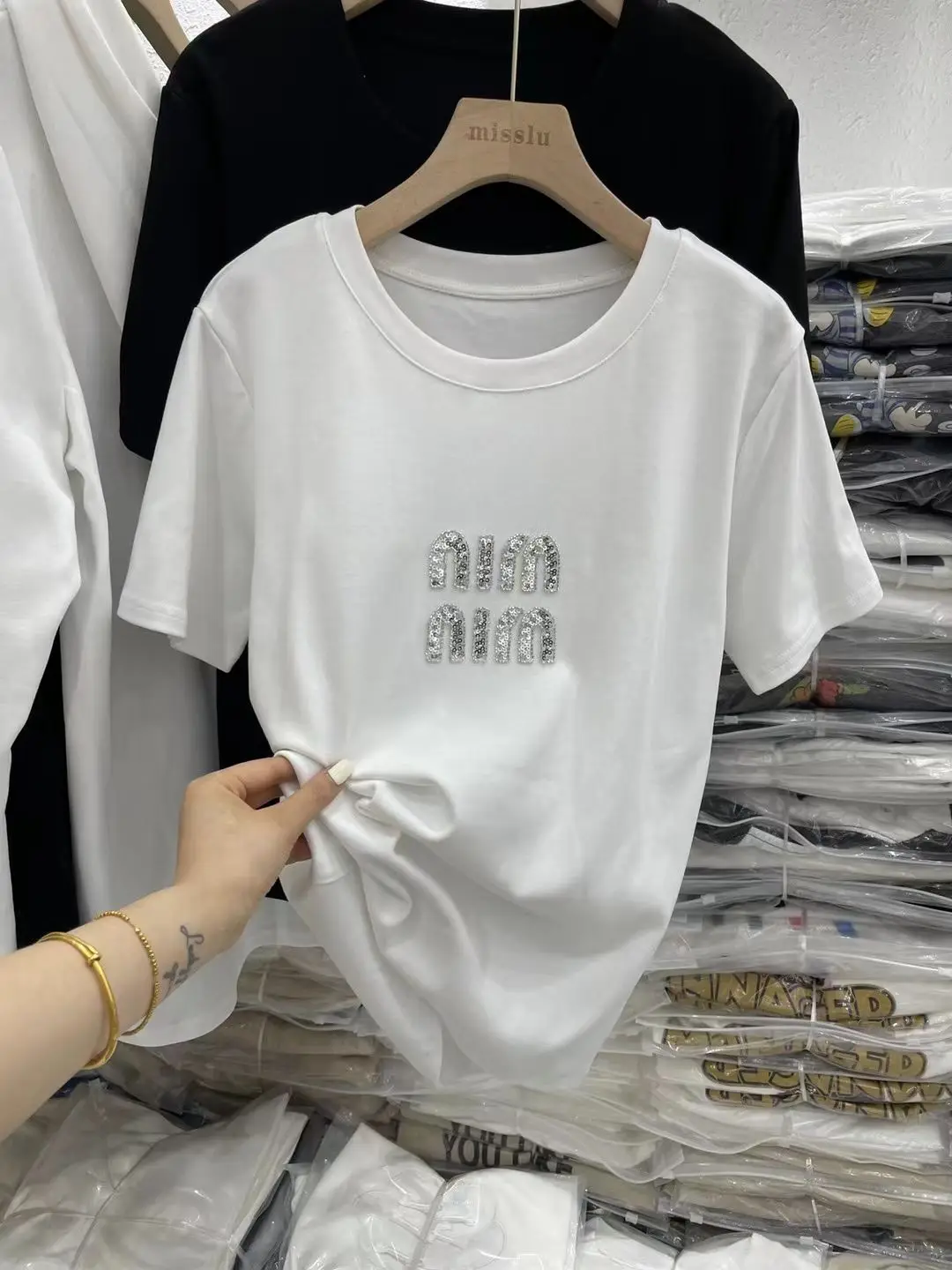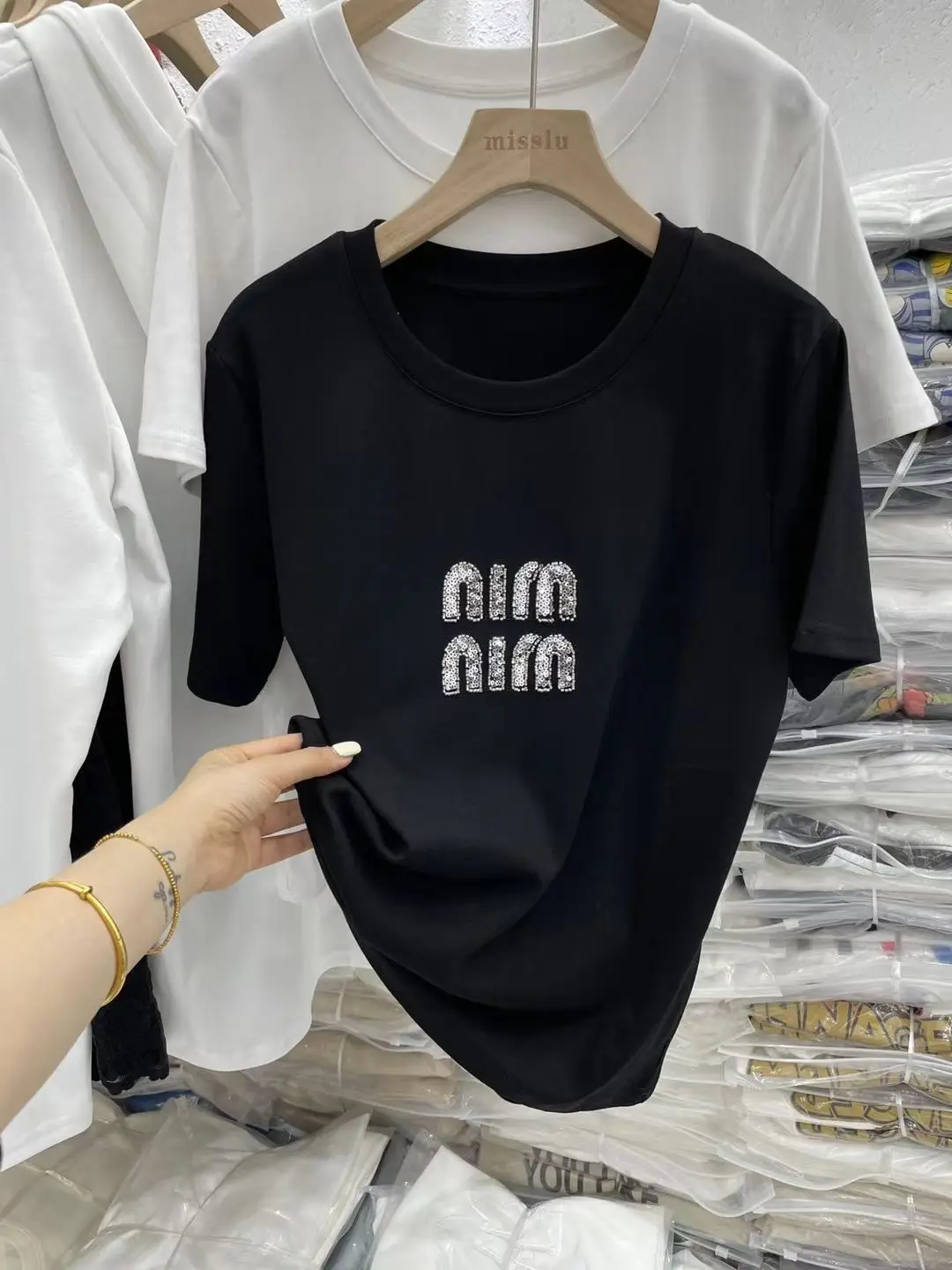 Women's Bead New Round Neck Heavy Industry Short Sleeve Summer T-shirt Fashion Casual Lady T-shirt