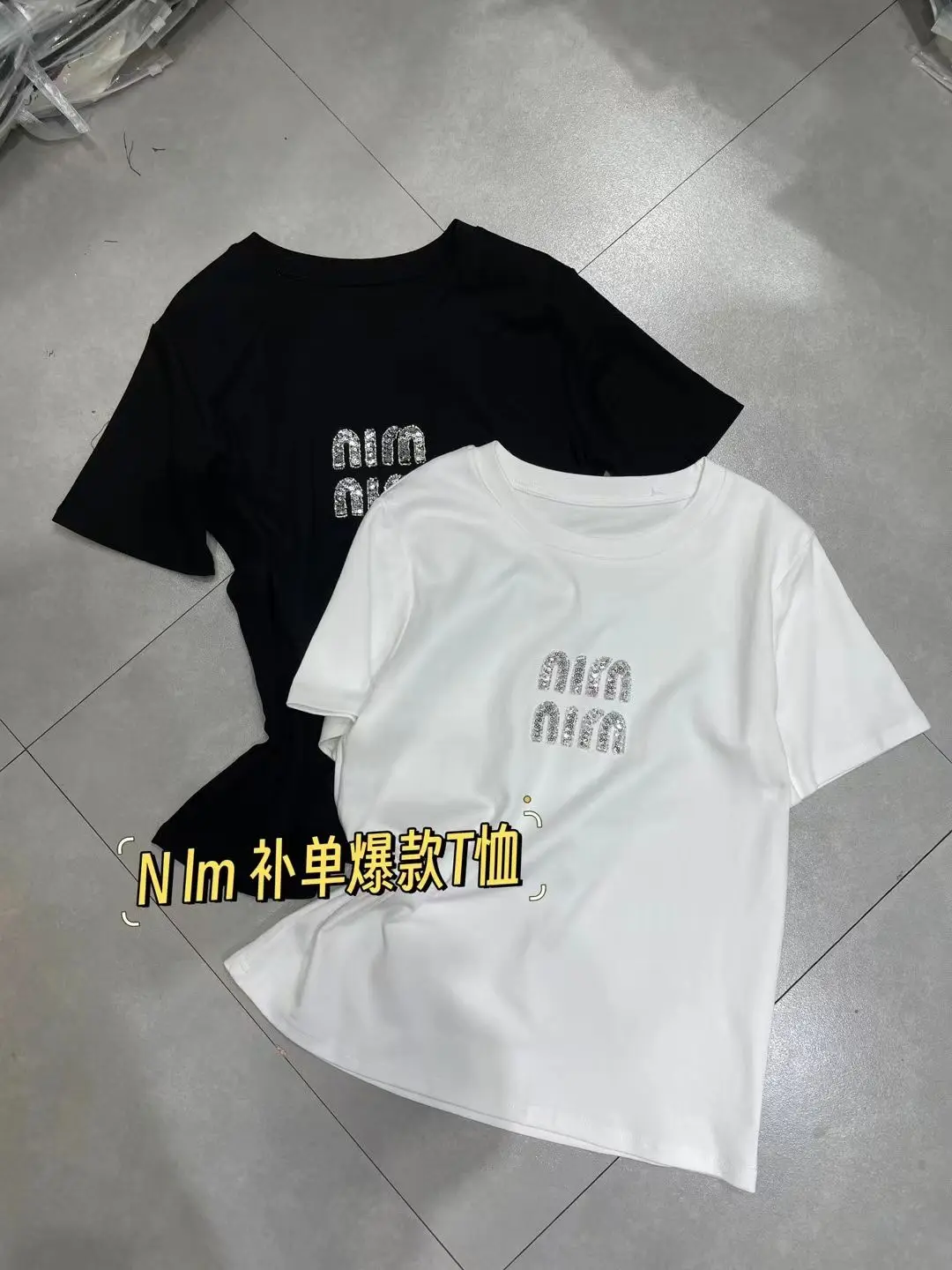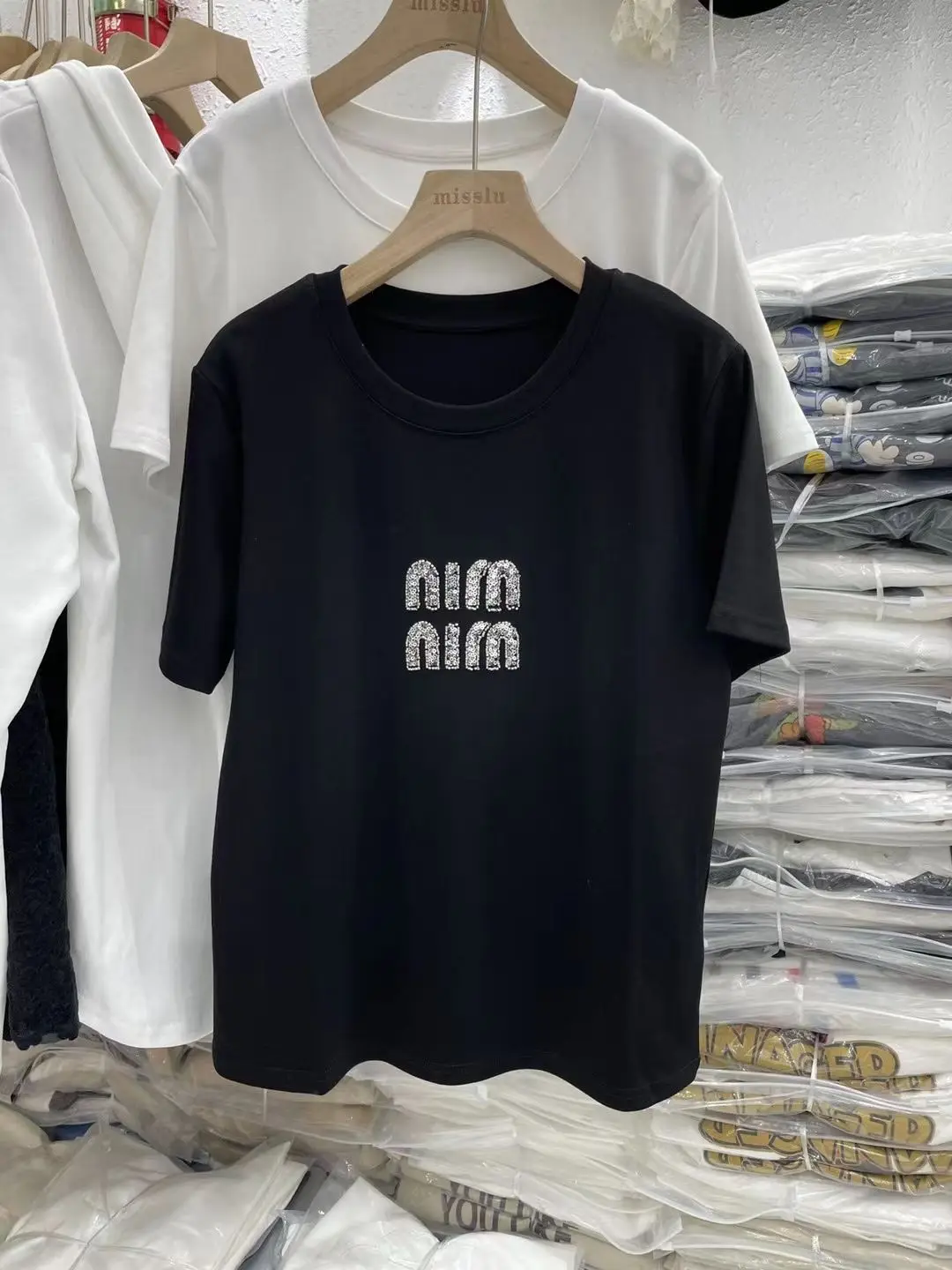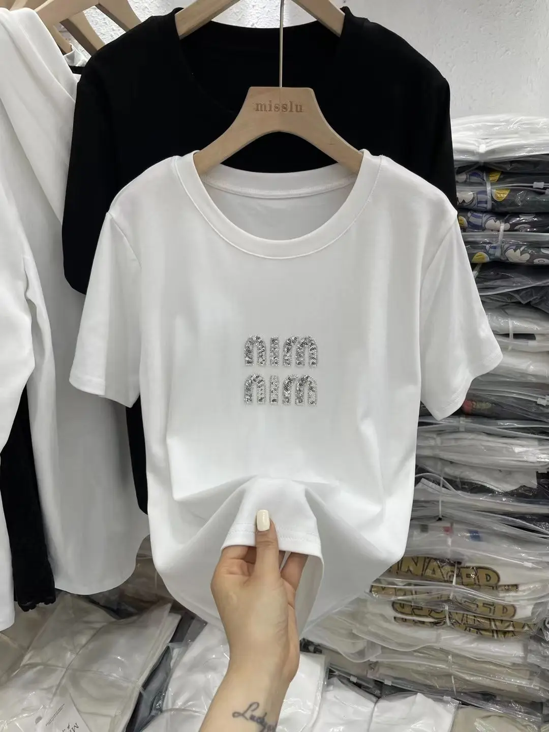 Women's Bead New Round Neck Heavy Industry Short Sleeve Summer T-shirt Fashion Casual Lady T-shirt