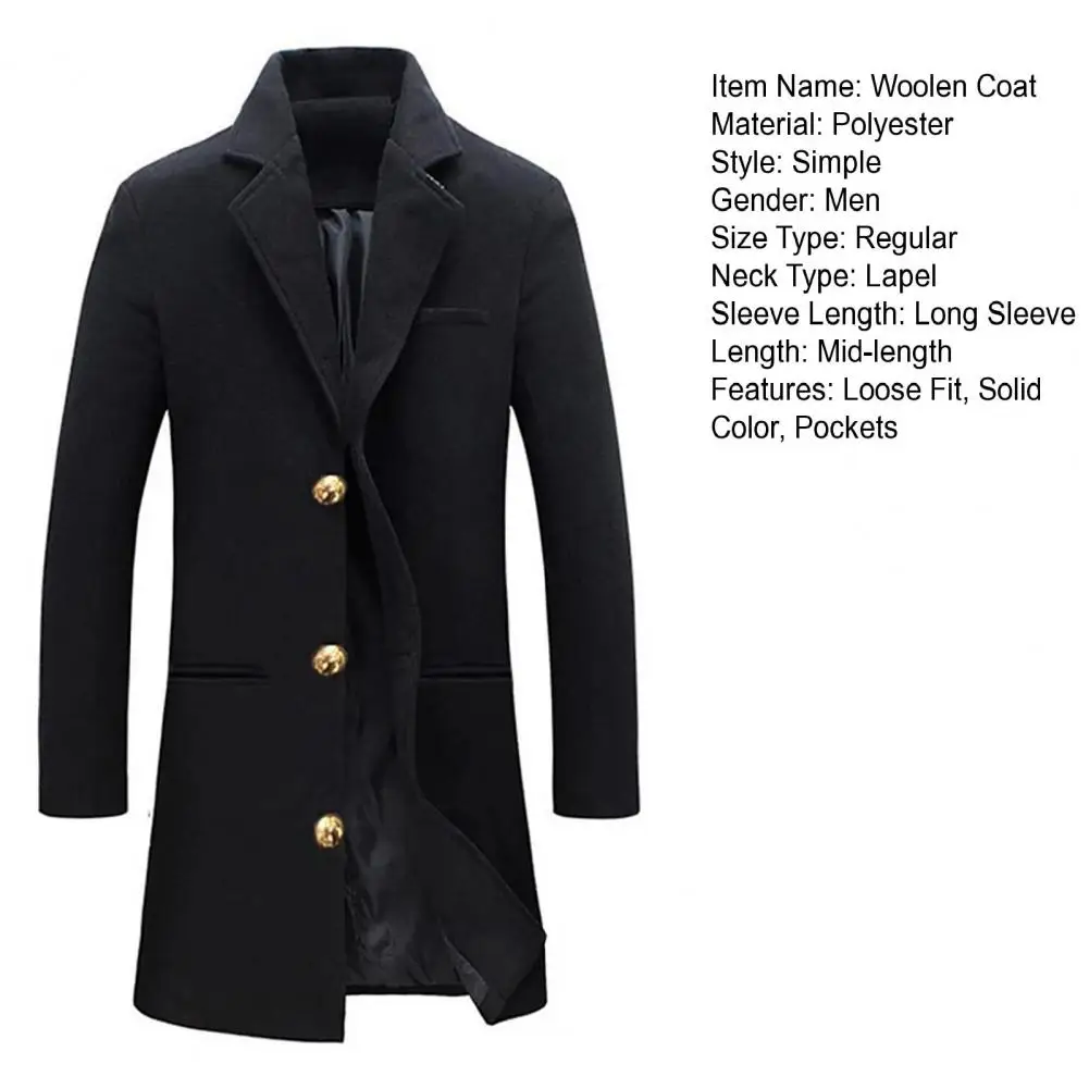 Men Woolen Coat Lapel Long Sleeve Single Breasted Jacket Coat with Pockets Solid Color Mid-length Outerwear